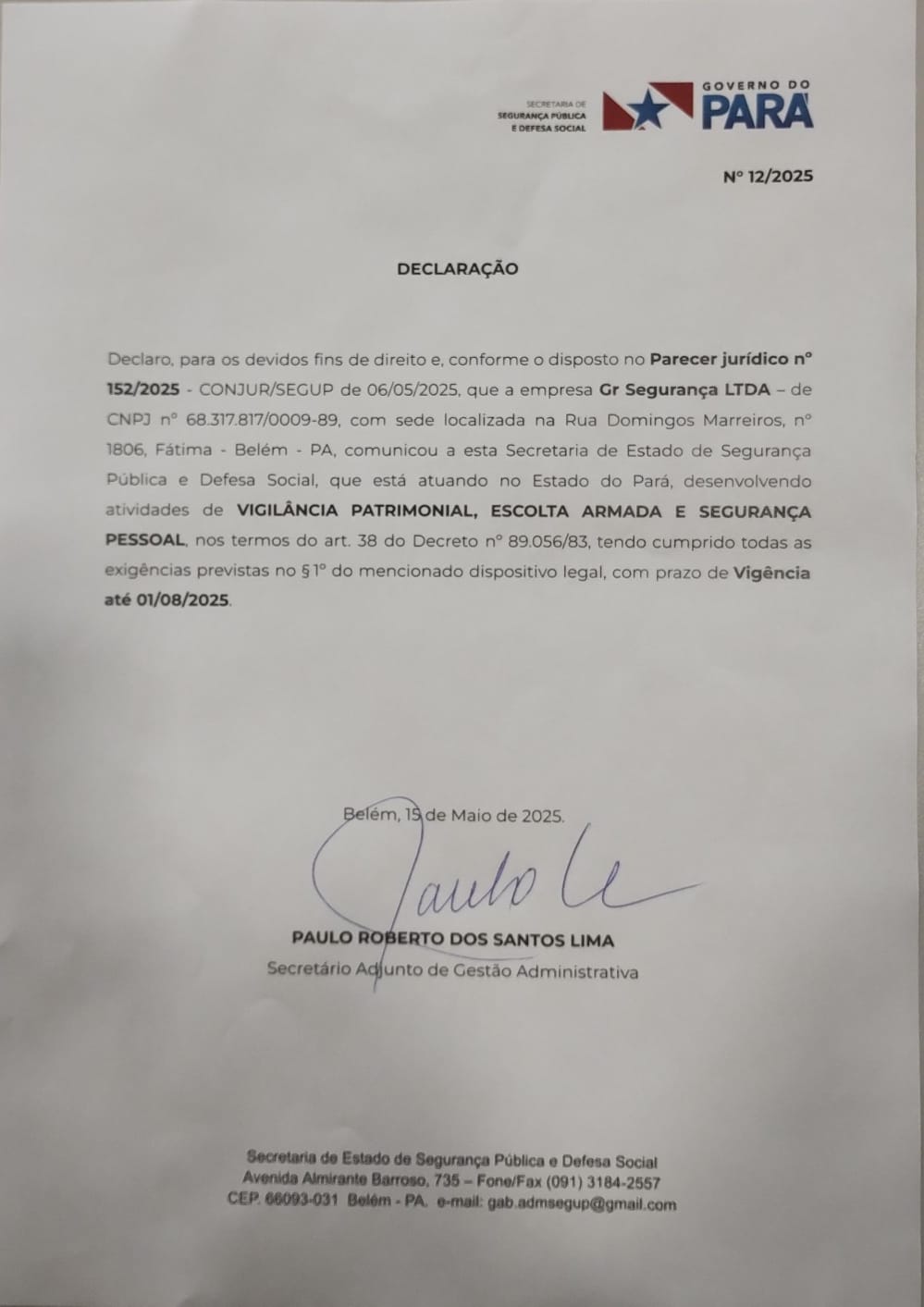 >> Maranhão >> Piauí >> Amazonas >> Minas Gerais >> Rio de Janeiro >> Bahia >> São Paulo >> Pará >> Ceará >> Pernambuco >> Espírito SantoO GRUPO GR possui Certificados de Regularidade para atuar com Segurança Privada: