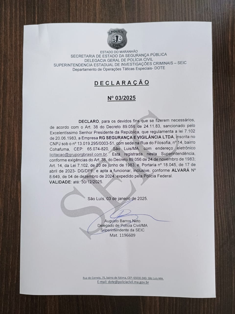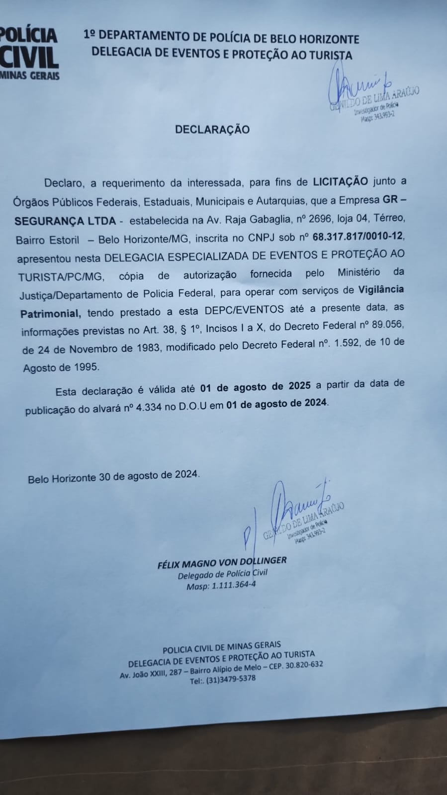 >> Maranhão >> Piauí >> Amazonas >> Minas Gerais >> Rio de Janeiro >> Bahia >> São Paulo >> Pará >> Ceará >> Pernambuco >> Espírito SantoO GRUPO GR possui Certificados de Regularidade para atuar com Segurança Privada: